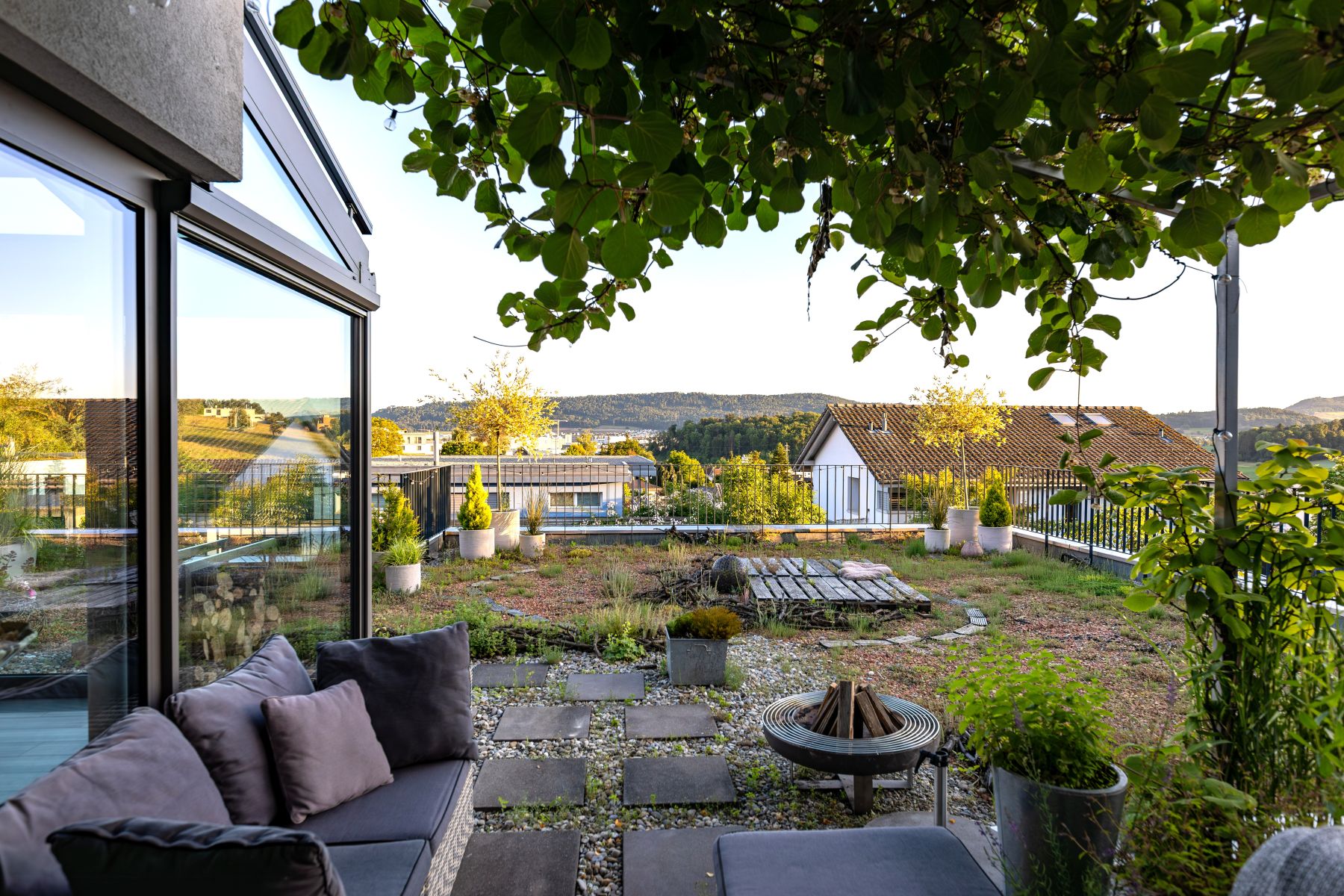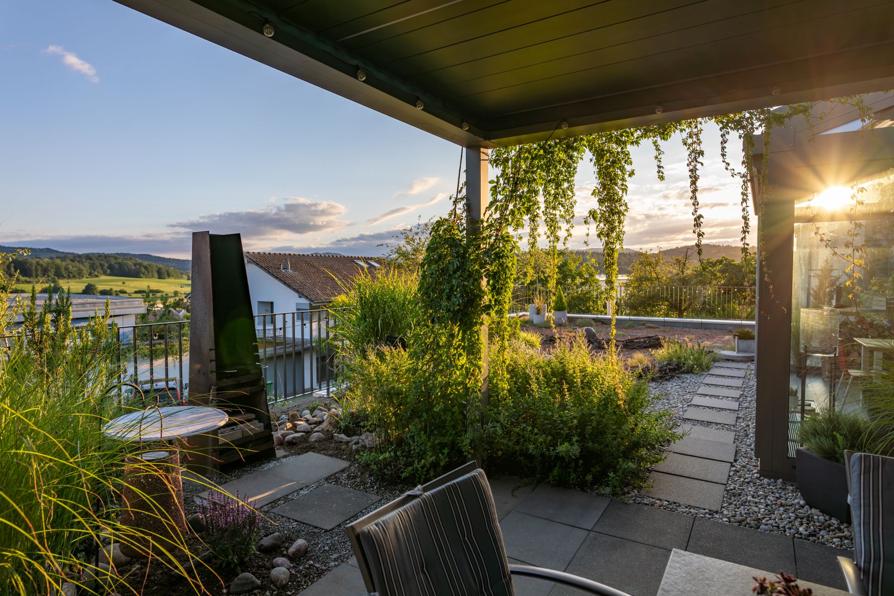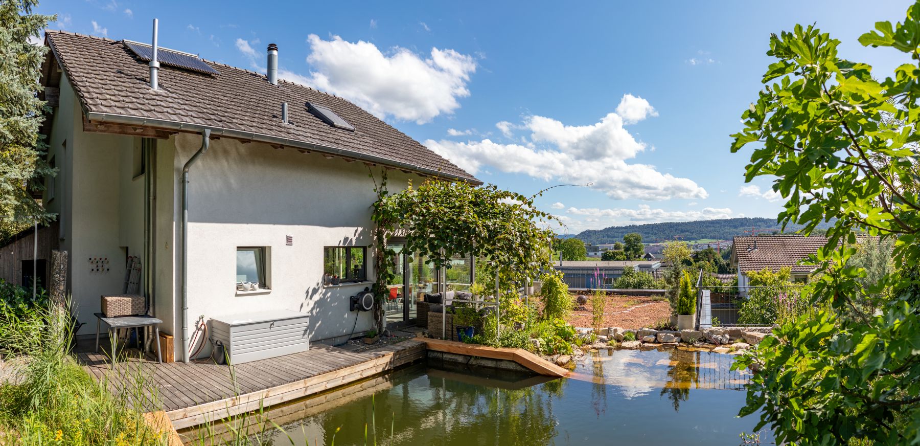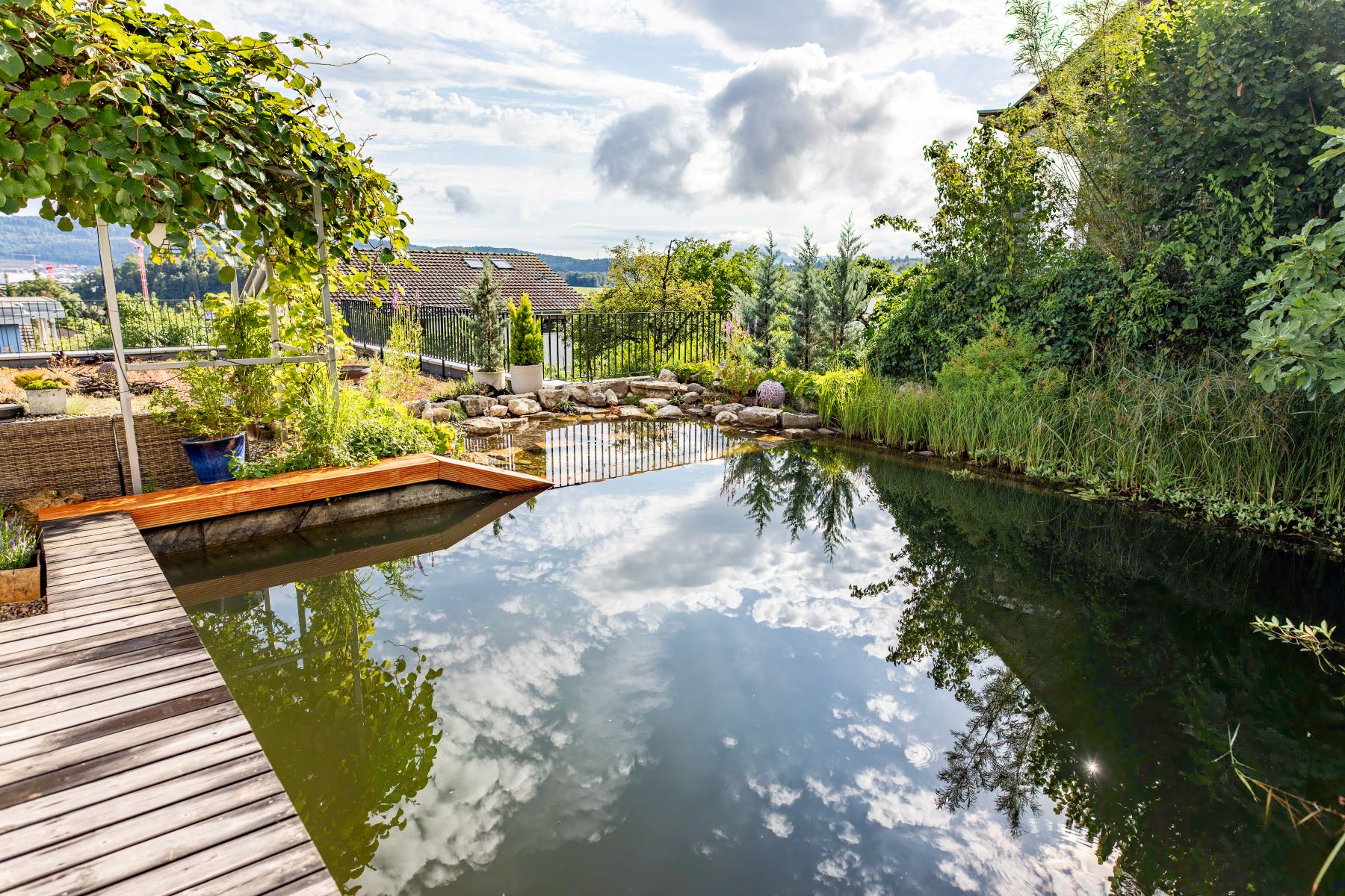 Der Aussenbereich ist ein kleines Paradies: Der gedeckte Sitzplatz gleich anschliessend an den Wintergarten lädt zu langen Abenden im Kerzenlicht ein. Unter der begrünten Pergola entsteht eine mediterrane Oase. Der natürliche Schwimmteich schenkt Erfrischung – nicht nur an heissen Sommertagen, sondern auch für die Seele. Jeder Winkel des Gartens wurde mit Sorgfalt und Liebe gestaltet, immer mit dem Ziel: Wohlfühlen, ankommen, entspannen.