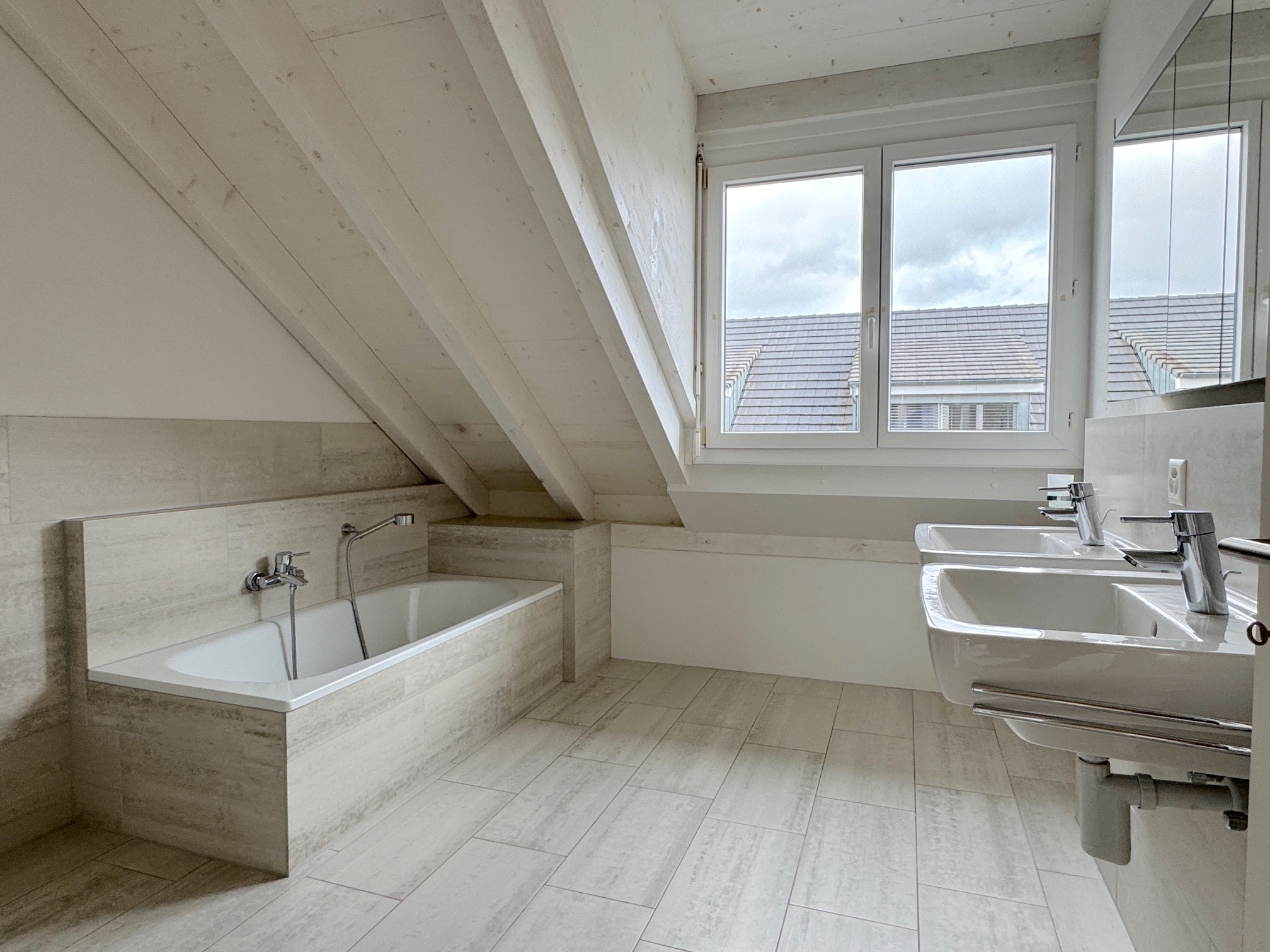Im oberen Stock befinden sich 3 gut geschnittene Schlafzimmer. Das grosse Badezimmer mit Wanne, separater Dusche und Doppellavabo bietet viel Platz und Komfort für den Familienalltag.