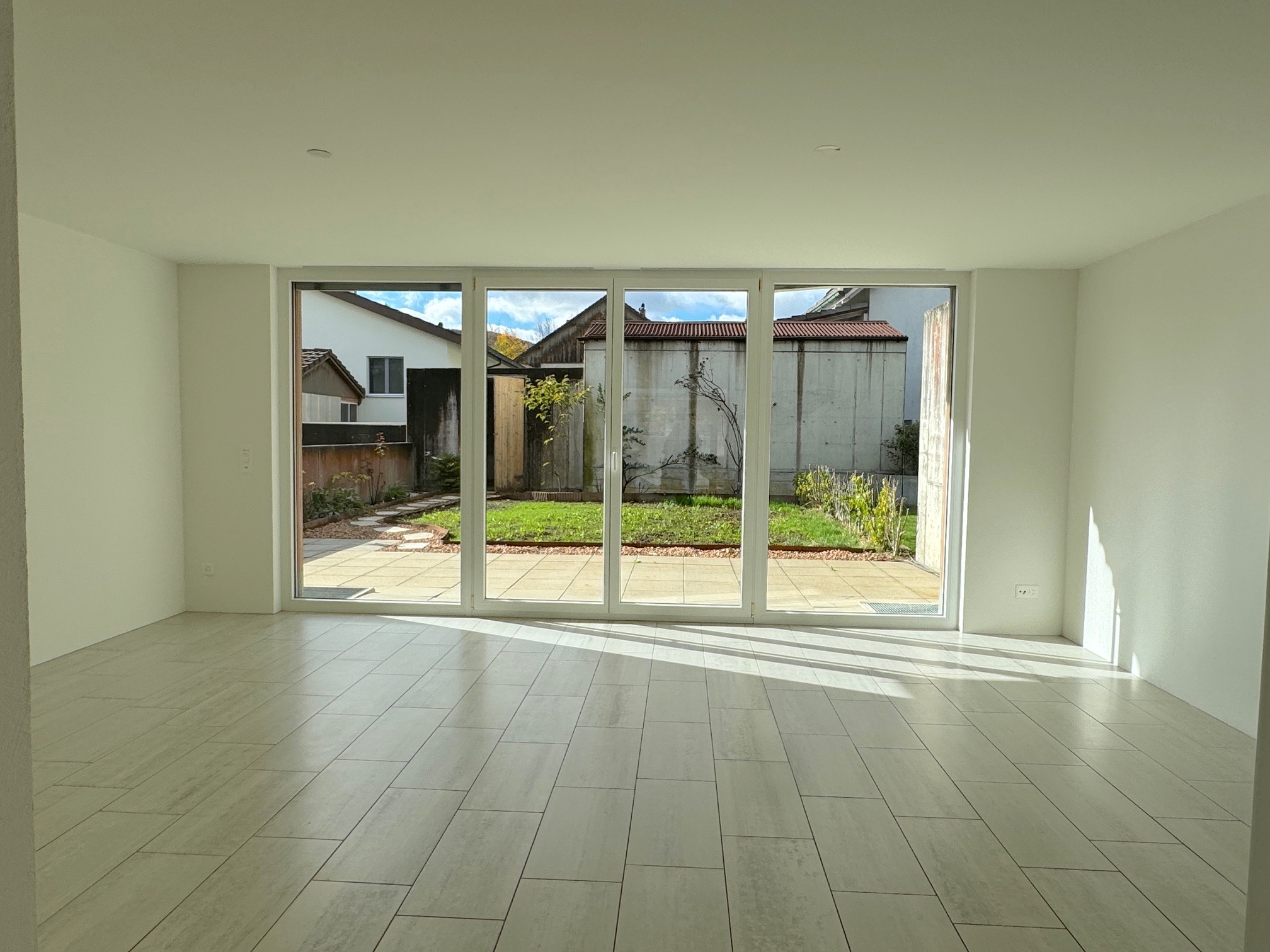 Beim Betreten des Hauses gelangt man in einen einladenden Eingangsbereich, der genügend Platz für eine Garderobe bietet. Rechter Hand befindet sich ein modernes Gäste WC mit Dusche, ideal für Besucher oder als zusätzliche Nutzung im Alltag. Linker Hand liegt das helle und grosszügige Wohnzimmer mit direktem Blick in den Garten sowie auf den Schopf – ein Ort zum Entspannen, Spielen oder Gärtnern. Hinter dem Eingangsbereich rechter Hand liegt die offene Wohnküche mit Essbereich. Sie bietet viel Arbeitsfläche und lädt dank ihrer Gestaltung zum Kochen und gemeinsamen Verweilen ein. Davor befindet sich eine Terrasse, die sowohl zum Frühstück in der Morgensonne als auch zu entspannten Abendstunden einlädt.