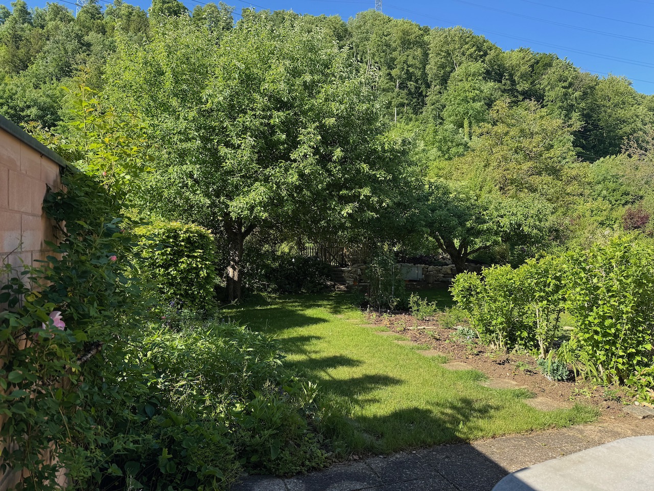 Vom Wohnzimmer aus gelangen Sie in einen sehr gepflegt angelegten Garten. Im hinteren Teil des Gartens kommen Sie durch ein Gartentörchen auf den gemeinschaftlich genutzten Weg und den dahinter liegenden Rösernenbach. Näher an einem Gewässer kann man nicht sein. Ein Spielplatz, diverse Sitzplätze sowie eine Grillstelle gehören anteilig zum Miteigentum.