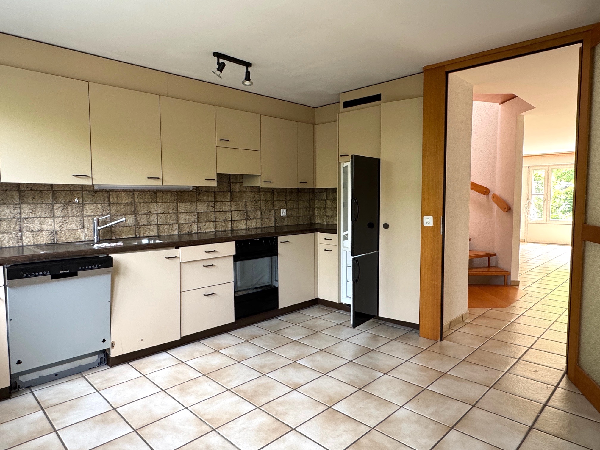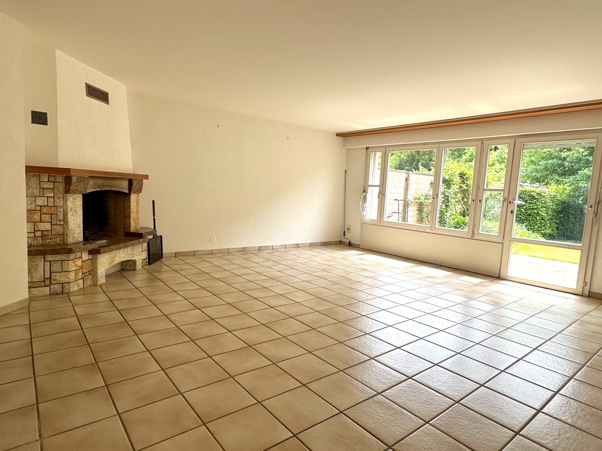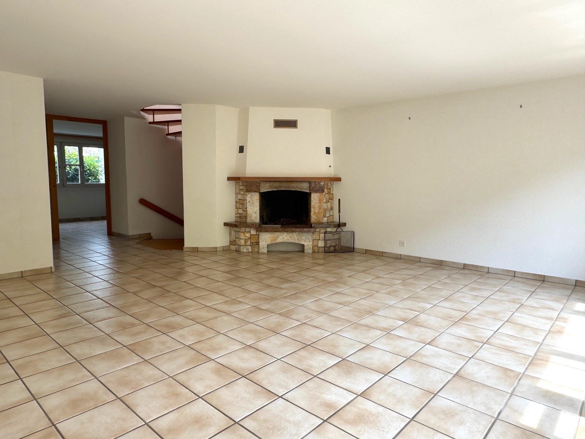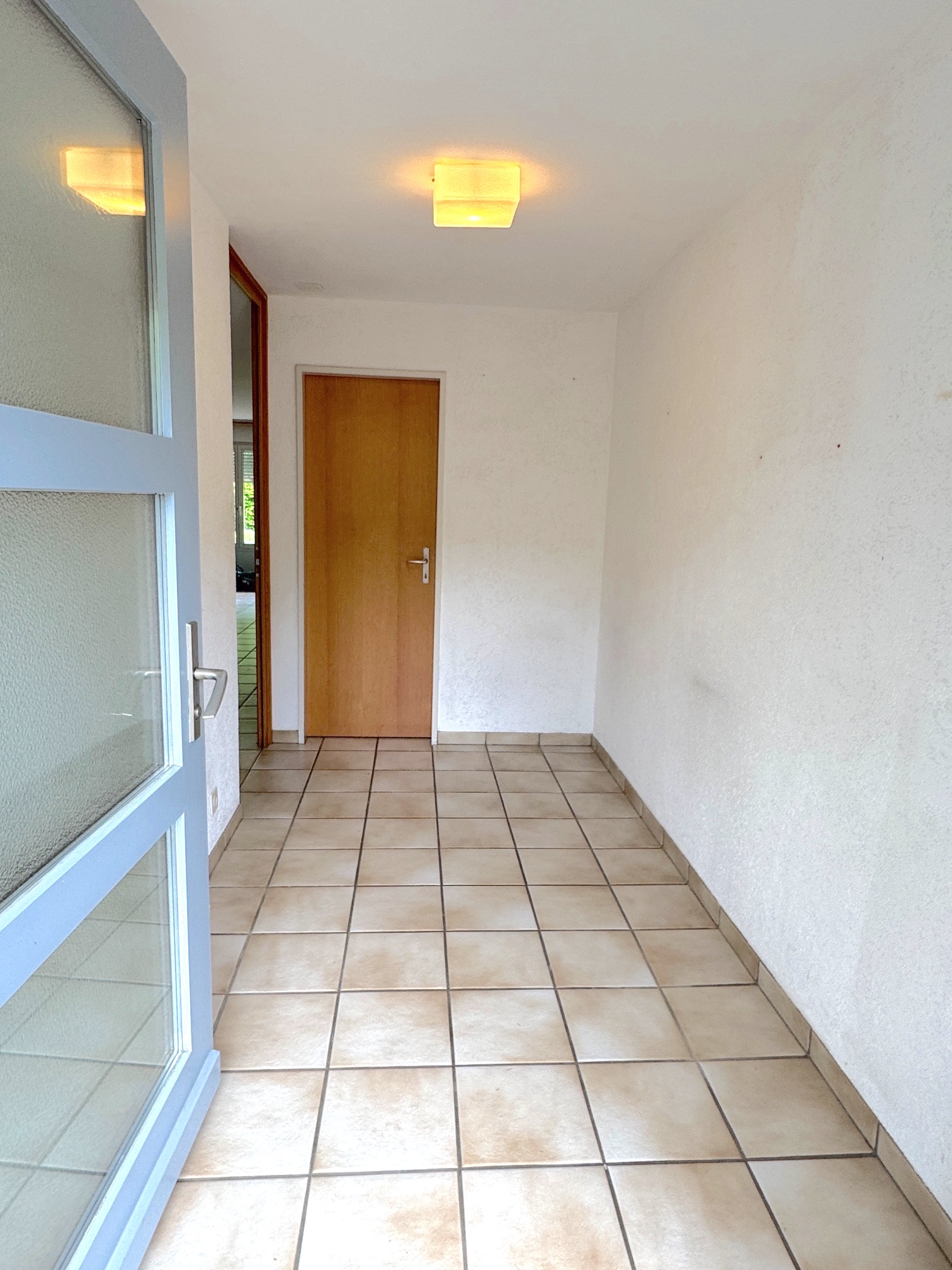 Nach dem Betreten des Hauses empfängt Sie ein geräumiger Eingangsbereich mit einem Gäste-WC. Nach dem Windfang gelangen Sie linkerhand in eine abgetrennte Küche, deren Grösse genügend Platz für einen 6-er Tisch aufweist. Rechterhand vom Eingang liegt der grosszügige Wohnbereich mit Zugang zum Garten. Ein funktionstüchtiger Cheminée sorgt für gemütliche Stunden in den Wintermonaten.