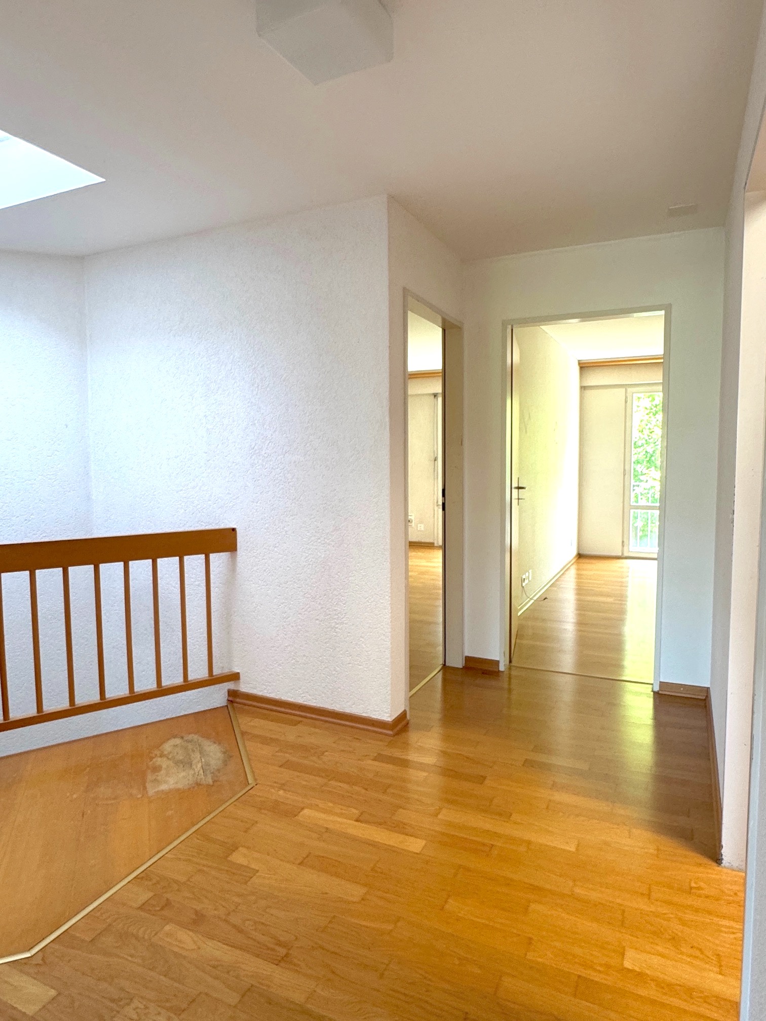 Grosse Fenster und Oberfenster im oberen Stockwerk durchfluten die Räume mit Tageslicht und bieten eine wunderbare Aussicht auf die ruhige Wohnlage und an den gegenüberliegenden Wald. Über eine Holztreppe gelangen Sie in das Obergeschoss, in dem Sie das Hauptbadezimmer und die 4 Schlafzimmer vorfinden.