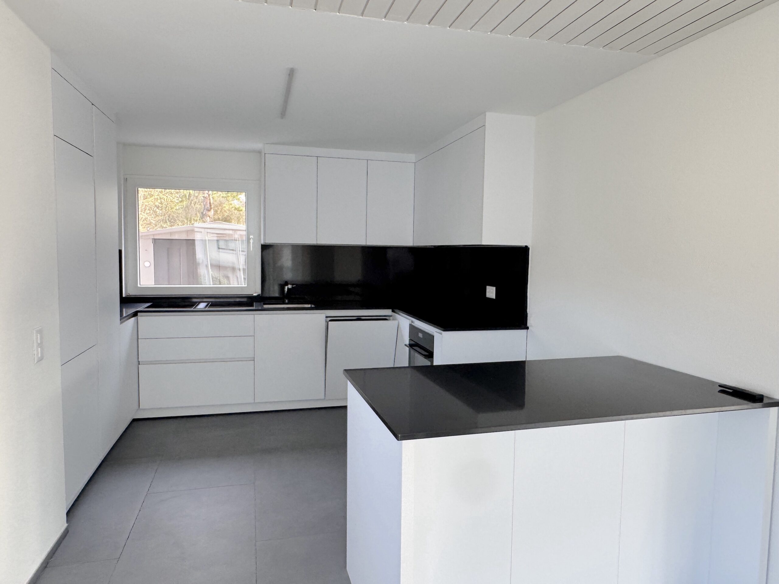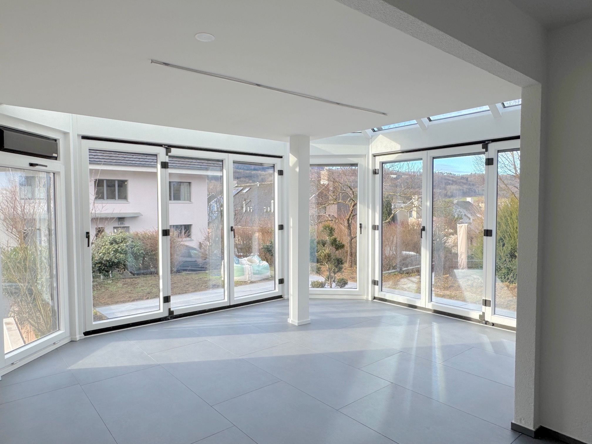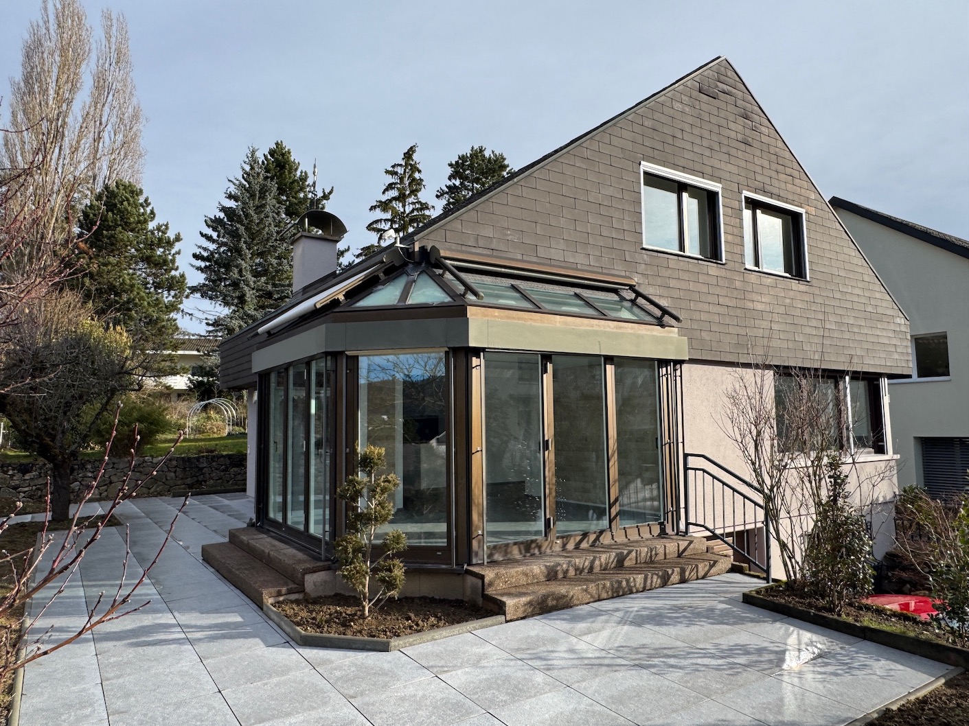 Linker Hand eröffnet sich durch eine Schiebetür der grosszügige Wohn- und Essbereich. Der integrierte Wintergarten erweitert den Essbereich und schafft zusammen mit der neuen, modernen Küche ein harmonisches Wohnkonzept. Grosse Fensterflächen auf drei Seiten sorgen für eine aussergewöhnliche helle und feundliche Wohnatmosphäre und lassen den gesamten Bereich in natürlichem Licht erstrahlen.