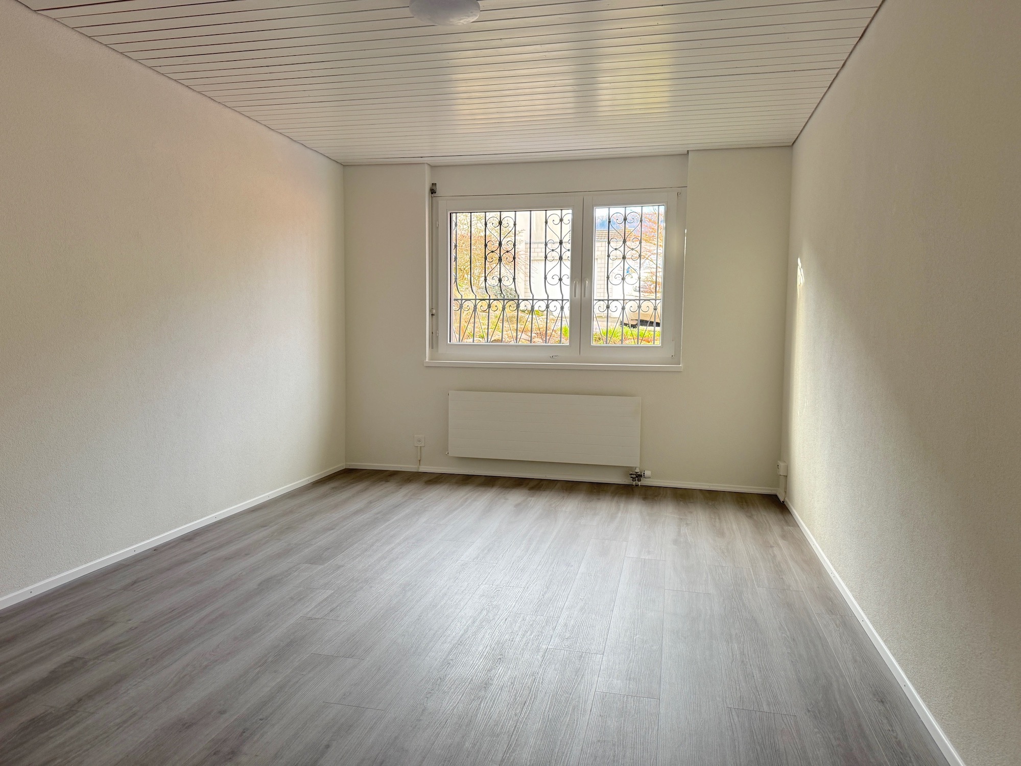 Im Untergeschoss liegt ein weiteres grosses beheiztes Zimmer, gegenüber befindet sich ein neues Badezimmer mit begehbarer Dusche und WC. Am Ende des Ganges liegt der Waschraum mit Waschmaschine, Trockner und der Ölheizung; nebenan befindet sich der Luftschutzkeller. Ein Haus interner Zugang zur Garage, welche mit elektrischem Rolltor ausgestattet ist, runden diese Eben ab. Vor der Garage können 2 weitere Autos parken.