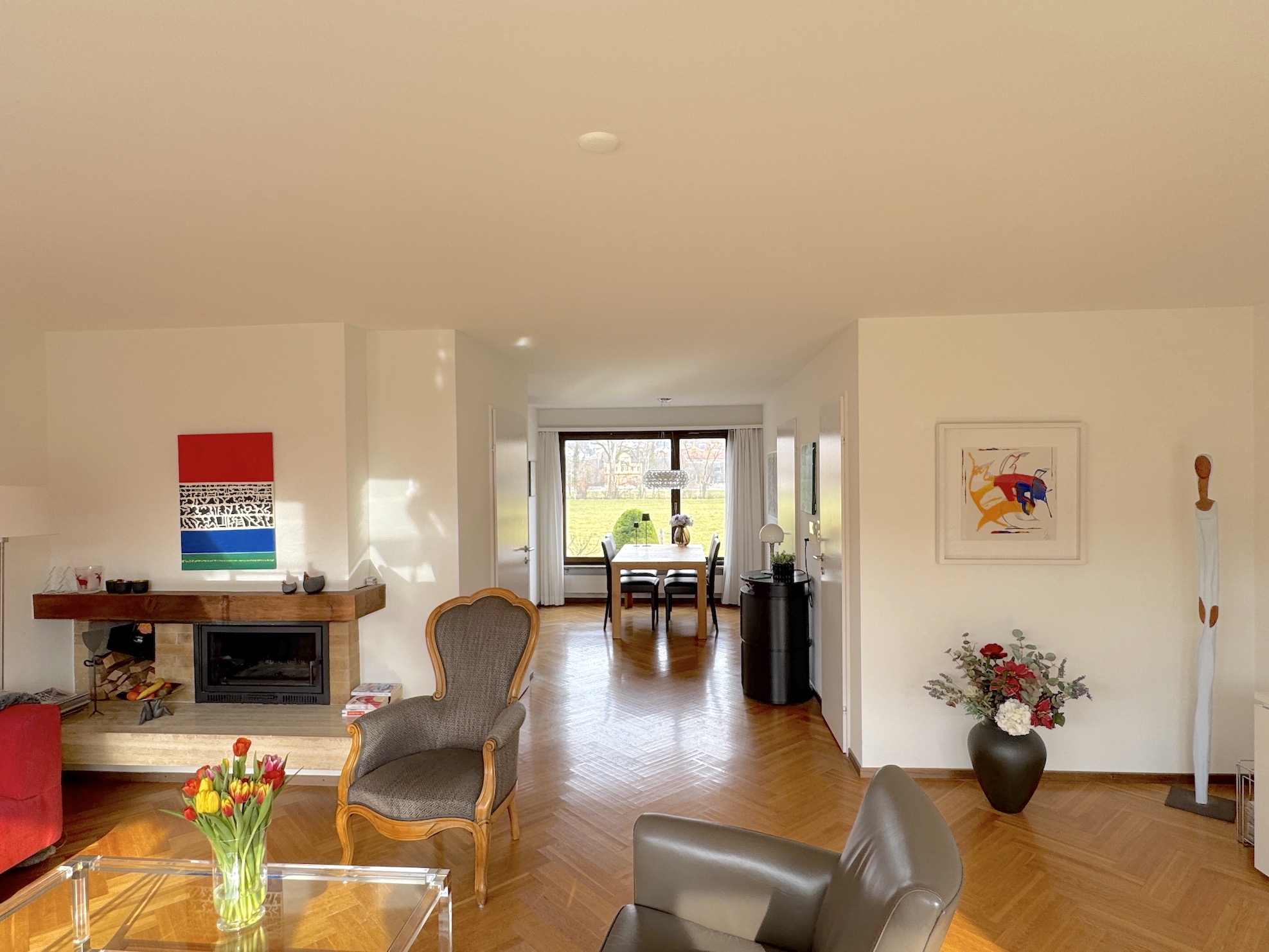 Im Erdgeschoss bilden der helle Essbereich und das freundliche Wohnzimmer mit direktem Zugang zum liebevoll gepflegten Garten das Herzstück des Hauses. Die Räume sind von zwei Seiten lichtdurchflutet und schaffen eine angenehme Wohnatmosphäre. Die Küche befindet sich in einem abgeschlossenen Raum hinter dem Essbereich und ein neu saniertes Gäste-WC rundnen diese Ebene ab.
