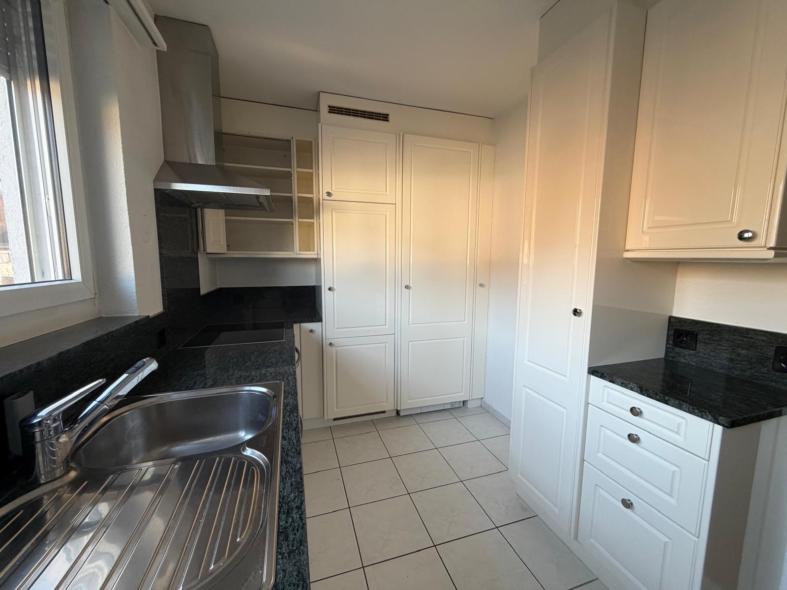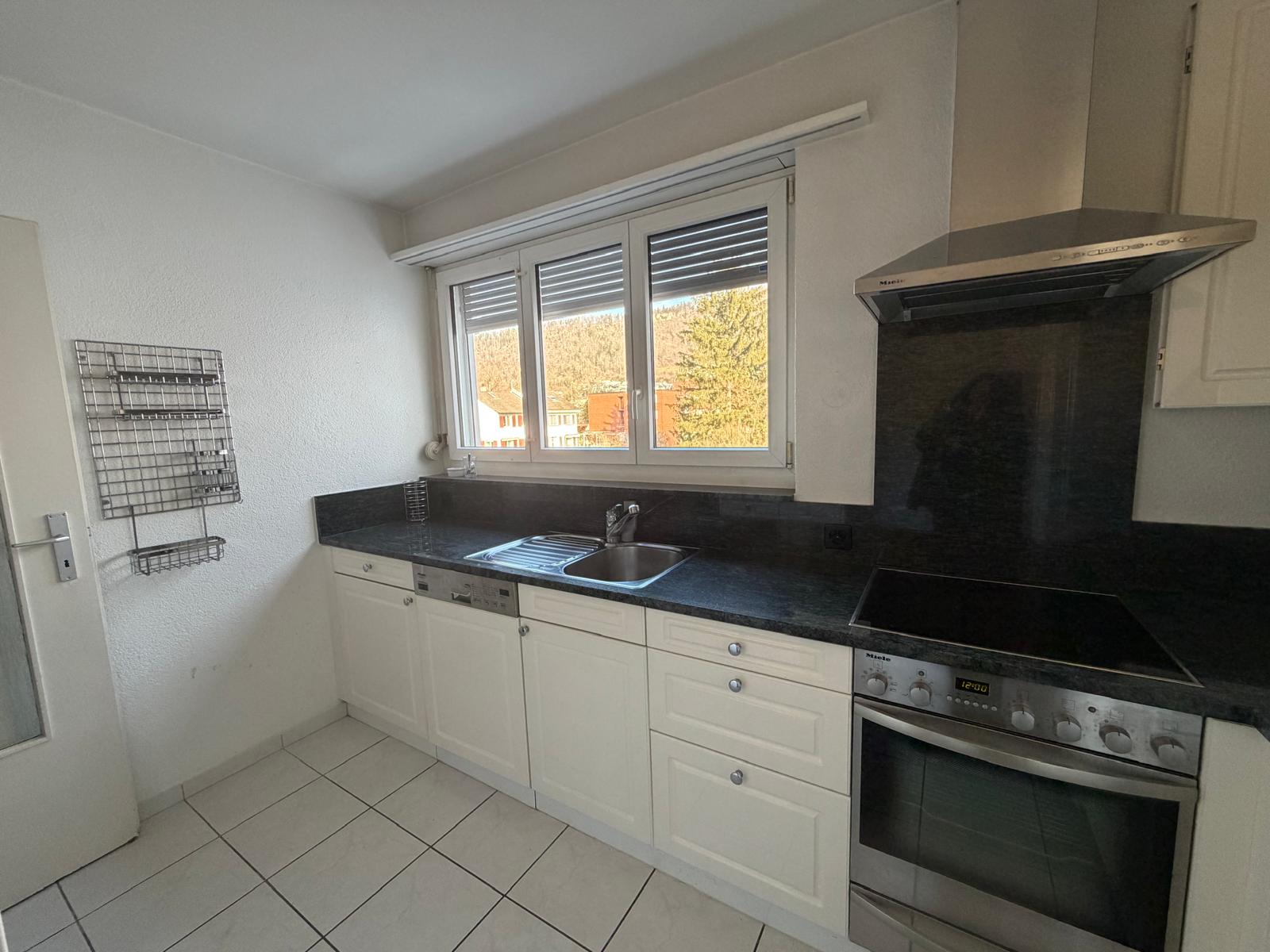 Die gepflegte Küche ist mit einer Granitabdeckung, Geschirrspülmaschine sowie einem integrierten Waschturm ausgestattet. Auch hier geniesst man einen schönen Ausblick ins Grüne.